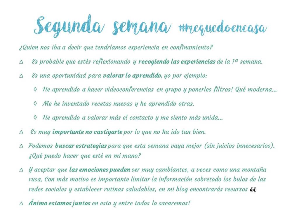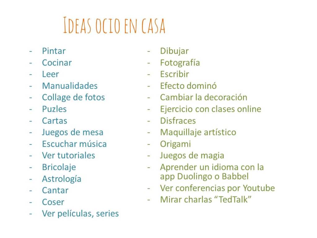 Creo que hay muchas cosas para estar entretenidos en casa y para hacer más agradable el confinamiento. No se trata de hacer todo lo que te propongo, simplemente seleccionar aquello que consideres que puede serte útil. ¡Te mando mucho mucho ánimo!