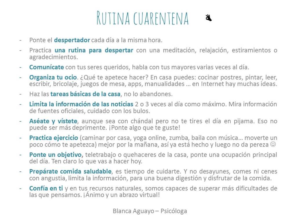 Lo más importante es empezar a limitar el exceso de información. Ver la televisión y acceder a la información en momentos puntuales. Y centrarte en información oficial y contrastada, cuidado con los bulos. Si no lo has hecho ya, empieza a diseñarte una rutina saludable para estar en casa. Aquí tienes unos consejos para diseñar tu rutina: